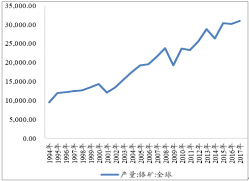 2017年全球鉻礦產(chǎn)量約為31,000.00千公噸,同比增長(zhǎng)2.65%。其中,南非是世界上最大的鉻礦生產(chǎn)國(guó),2017年鉻礦產(chǎn)量占全球的48.39%,哈薩克斯坦、印度、土耳其分別比17.42%,10.32%和9.03%。2017年南非鉻礦產(chǎn)量為15,000.00萬(wàn)噸,同比增長(zhǎng)2.04%。
