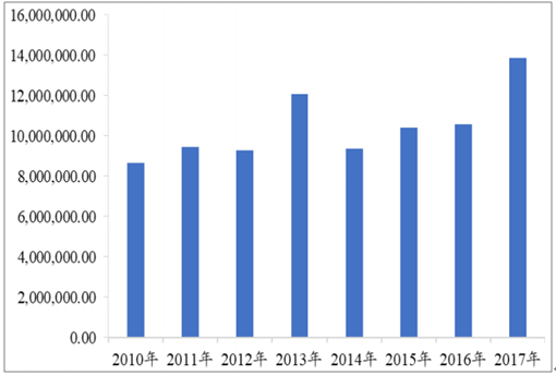 2010-2017年我國(guó)進(jìn)口鉻礦數(shù)量變化(噸)