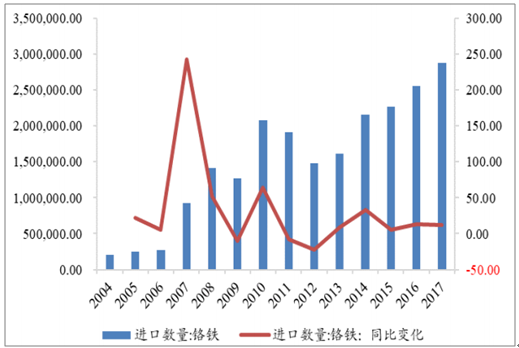 2004-2017年我國(guó)鉻鐵進(jìn)口數(shù)量(噸)及其同比變化(%)