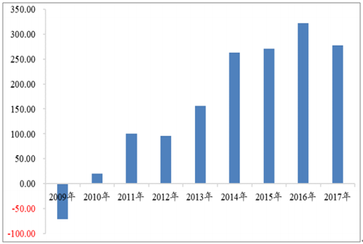 2009-2017年我國(guó)不銹鋼凈出口(萬(wàn)噸)
