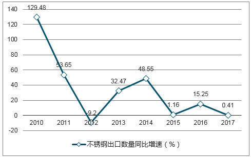 2009-2017年,我國(guó)不銹鋼出口數(shù)量年均復(fù)合增長(zhǎng)率為28.37%;但近年來(lái)增速放緩,2017年實(shí)現(xiàn)不銹鋼出口數(shù)量395.30萬(wàn)噸,同比增長(zhǎng)0.41%,創(chuàng)歷史新高。據(jù)中國(guó)特鋼企業(yè)協(xié)會(huì)不銹鋼分會(huì)最新數(shù)據(jù),2018年一季度全國(guó)出口不銹鋼102.4萬(wàn)噸,與2017年一季度同比增加12.3萬(wàn)噸,增長(zhǎng)13.7%。