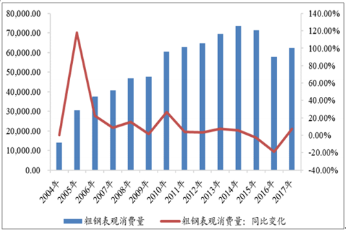 2017年,我國(guó)粗鋼表觀消費(fèi)量為62,352.57萬(wàn)噸,同比增長(zhǎng)7.76%,創(chuàng)10年來(lái)最高增速;不銹鋼表觀消費(fèi)量自2008年后持續(xù)高速增長(zhǎng),但近年來(lái)增速放緩,2017年,不銹鋼表觀消費(fèi)量創(chuàng)歷史最高水平1984.68萬(wàn)噸,增速為5.37%。