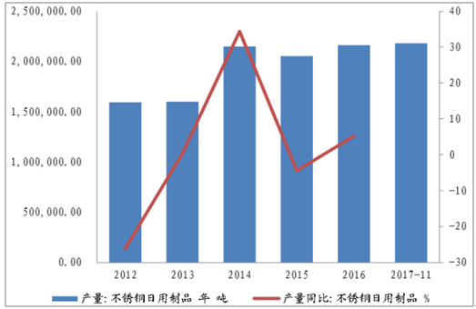 2015-2017年的產(chǎn)量可由不銹鋼日用品產(chǎn)量側(cè)面反映,在此期間,不銹鋼日用品產(chǎn)量穩(wěn)定增長(zhǎng),2016年不銹鋼日用品產(chǎn)量216.09萬(wàn)噸,同比增長(zhǎng)5.23%,截至2017年11月,不銹鋼日用品產(chǎn)量已達(dá)217.83萬(wàn)噸,預(yù)計(jì)2017年將穩(wěn)速增長(zhǎng)。