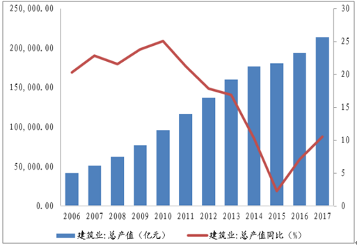 2006-2017年我國(guó)建筑業(yè)總產(chǎn)值(億元)及總產(chǎn)值同比(%)