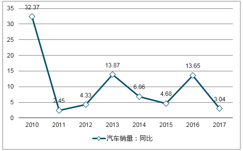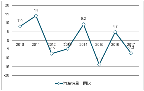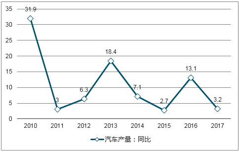2008年-2017年汽車(chē)產(chǎn)量同比變化(%)